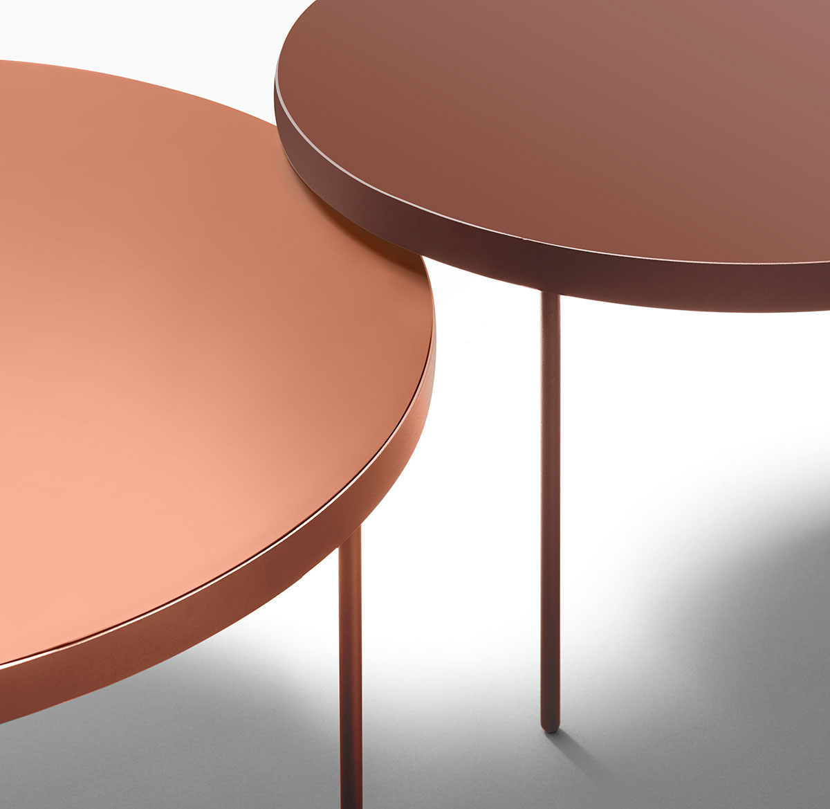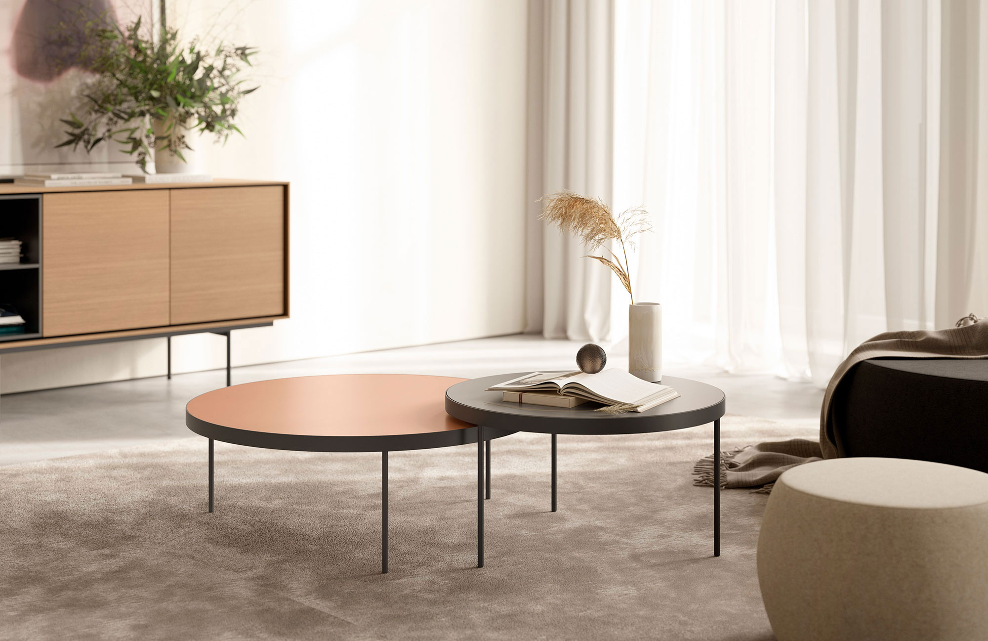 (Abajo) Mesas Gau de diámetro 85 y 65 cms en brick y visón. Las alturas son 30 cms y 35 cms.