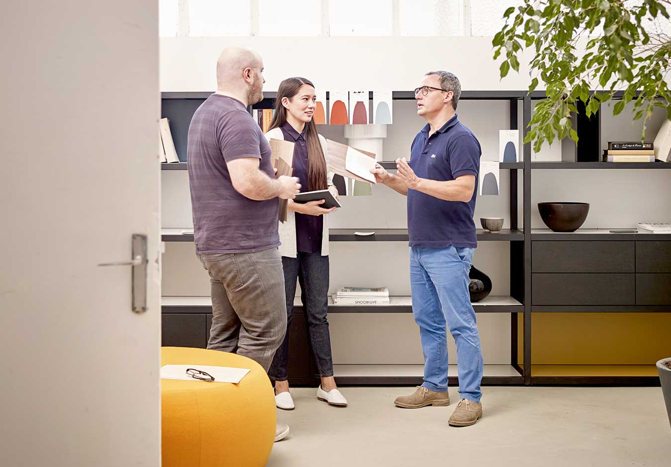 (Arriba) Kiyomi Higuchi, Jean Louis Iratzoki y Ander Lizaso eligiendo colores de la colección Kai, para las tiendas de DWR.