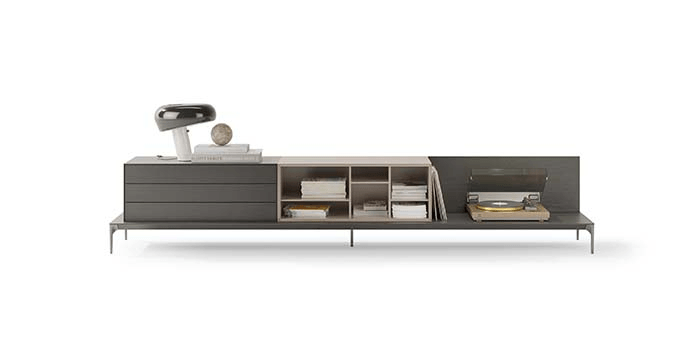 Animación y fotografías de diferentes composiciones de muebles bajos Treku. Cada imagen está enlazada con la página de su colección.