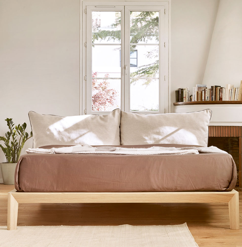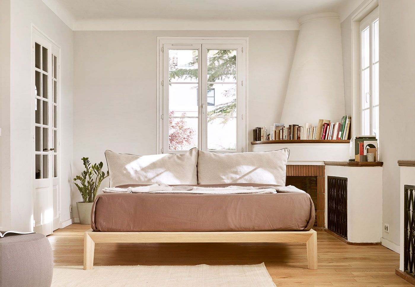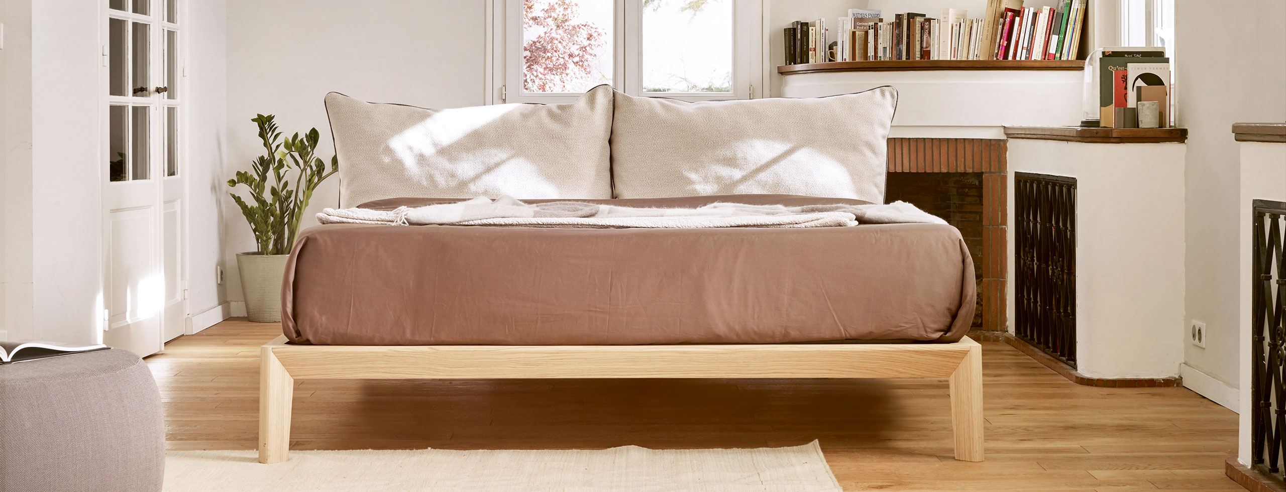 La cama Bora transmite confort por todas sus esquinas. Invita a echarte en ella y leer apoyado en sus mullidos cojines o descansar plácidamente dejándote llevar por los mejores sueños. Los cojines son desenfundables y con opciones de diferentes telas y pieles. Para la estructura se pueden elegir cualquiera de las maderas de la oferta de Treku.