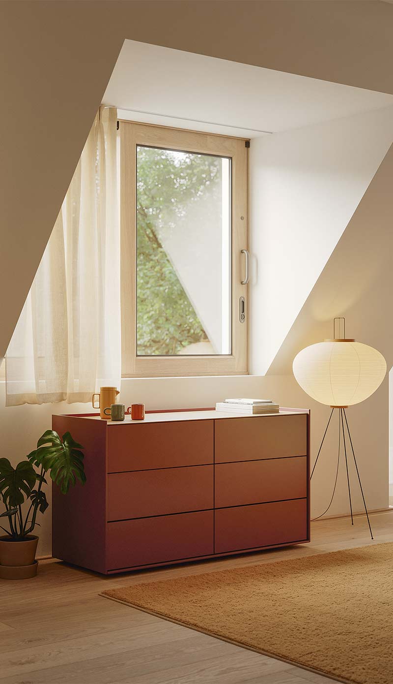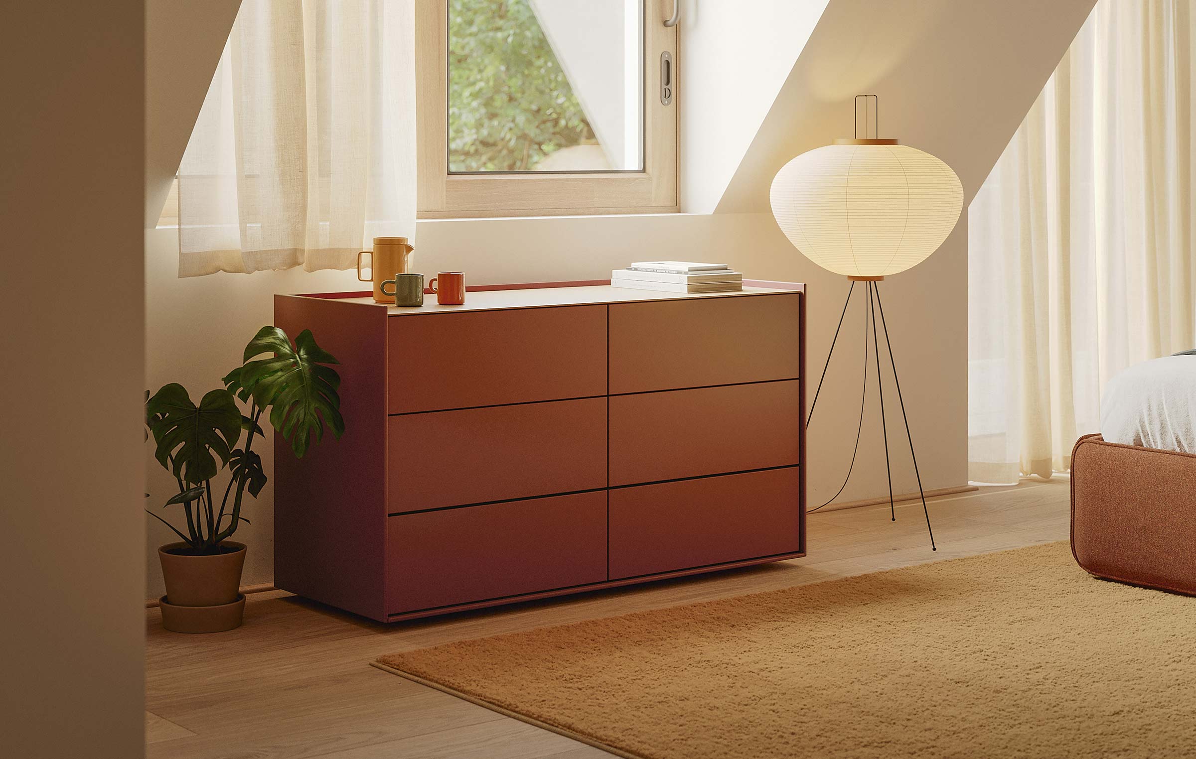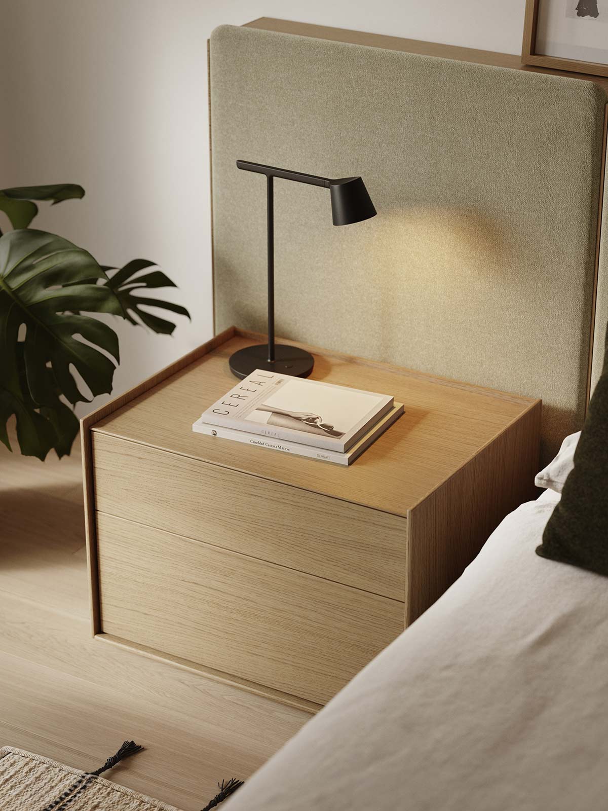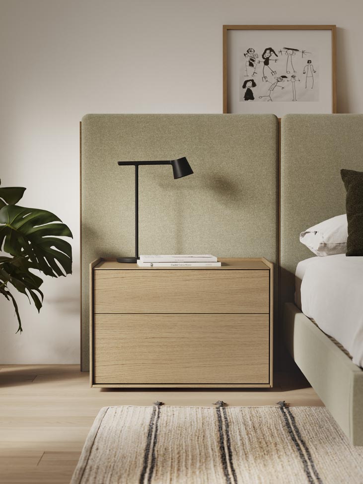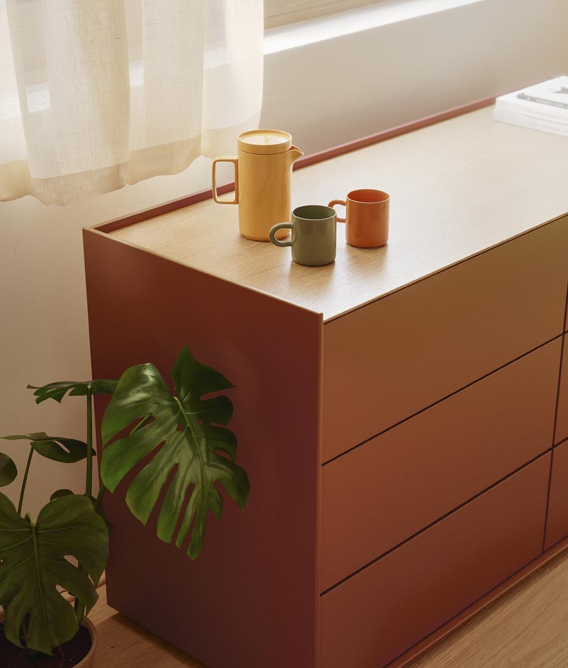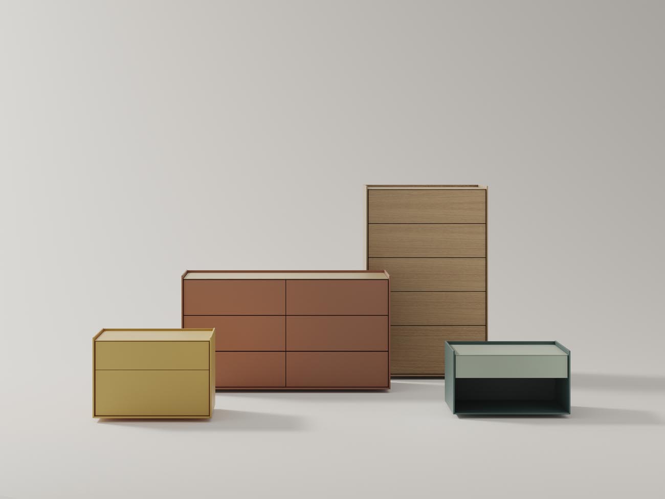 Bera es una colección de mesillas, cómodas y chiffoniers para el dormitorio. La encimera y los cajones se pueden acabar en un color o madera diferente al cuerpo del mueble y por tanto las posibles combinaciones son infinitas.